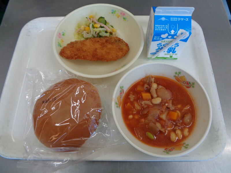 コッペパン 牛乳 高野豆腐のスープ チリコンカン ごまドレサラダ