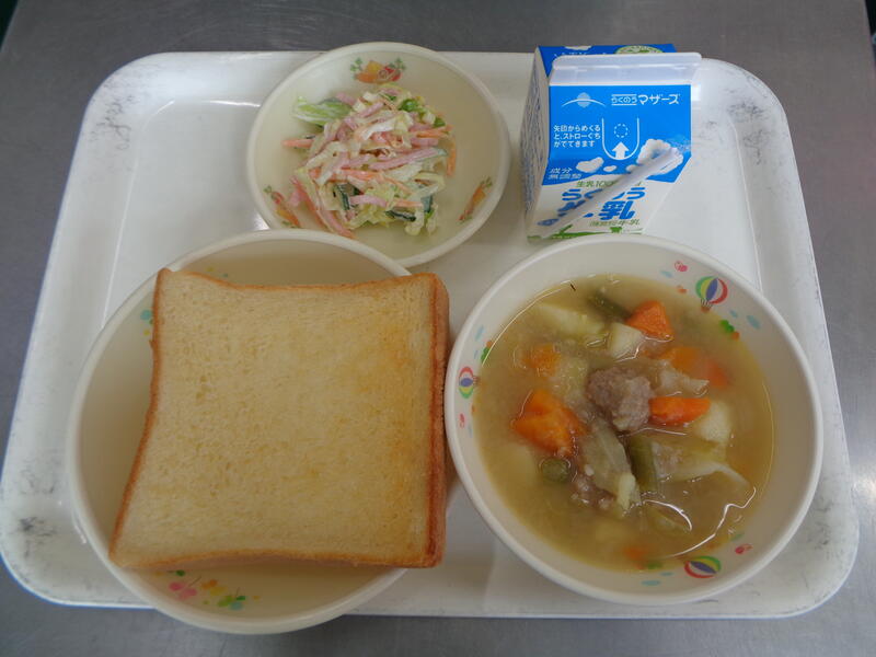はちみつレモントースト 牛乳 肉団子と野菜の煮込み チーズサラダ