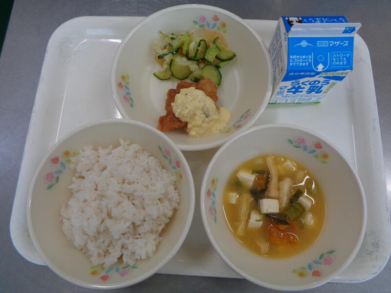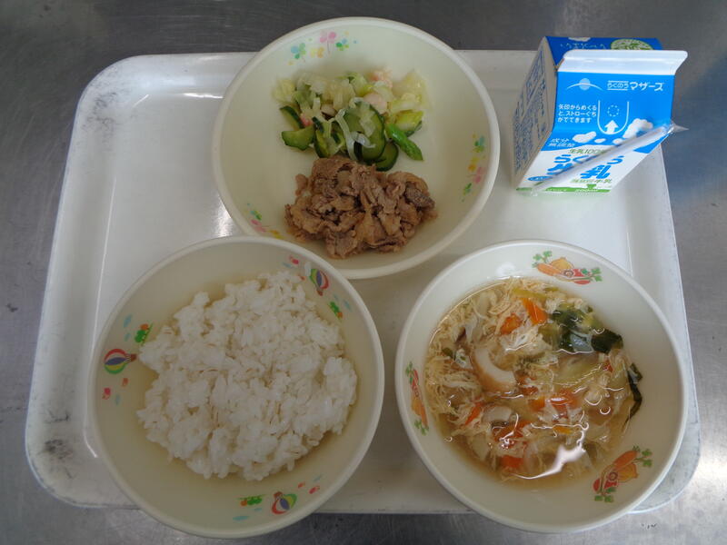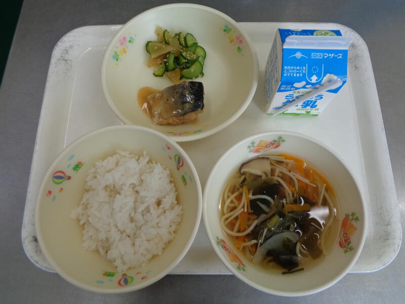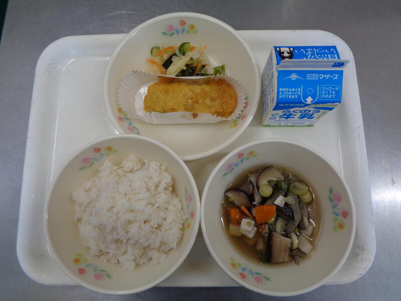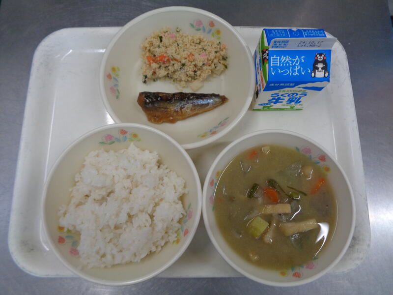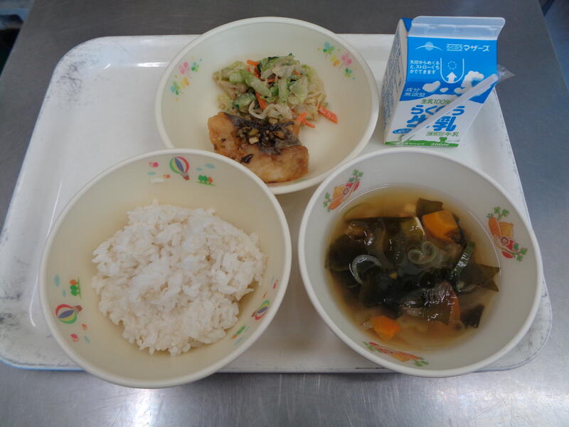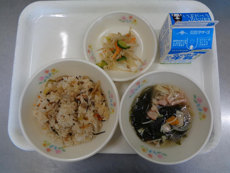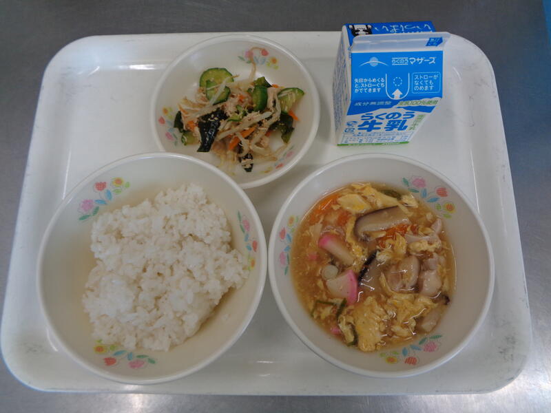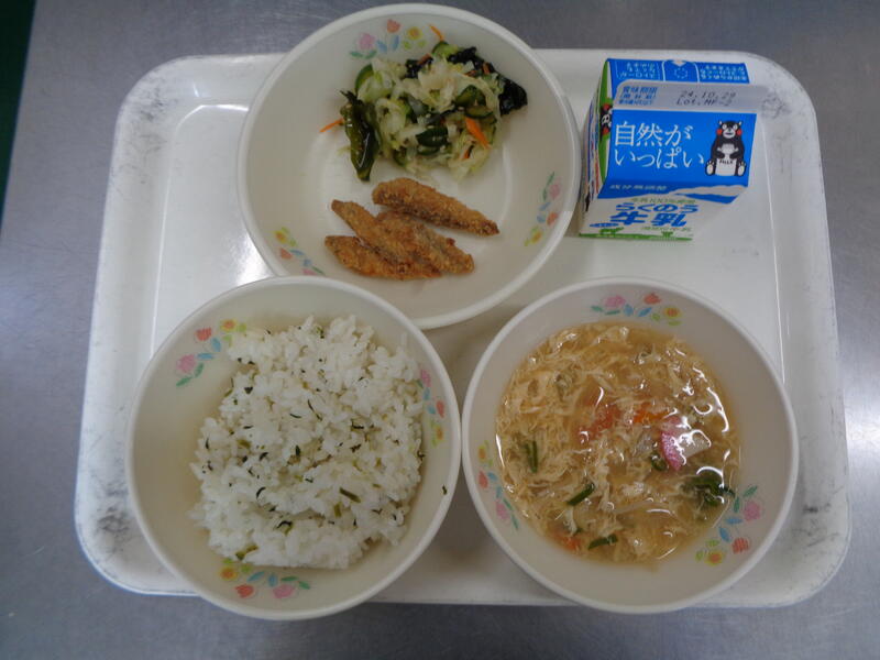 菜めし 牛乳 かきたま汁 小イワシの梅の香揚げ きゅうりとわかめの酢の物