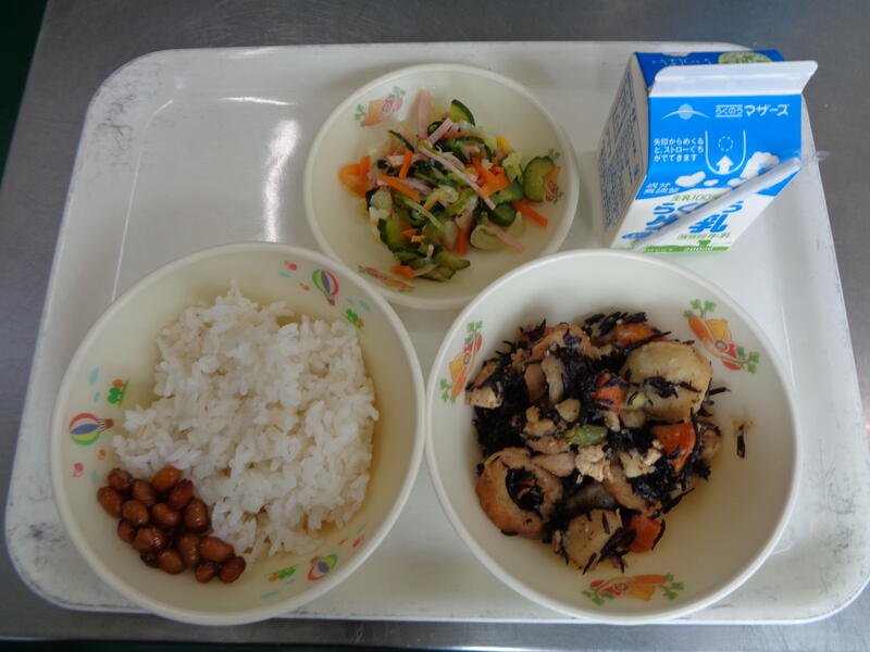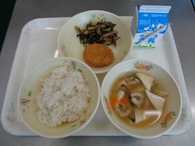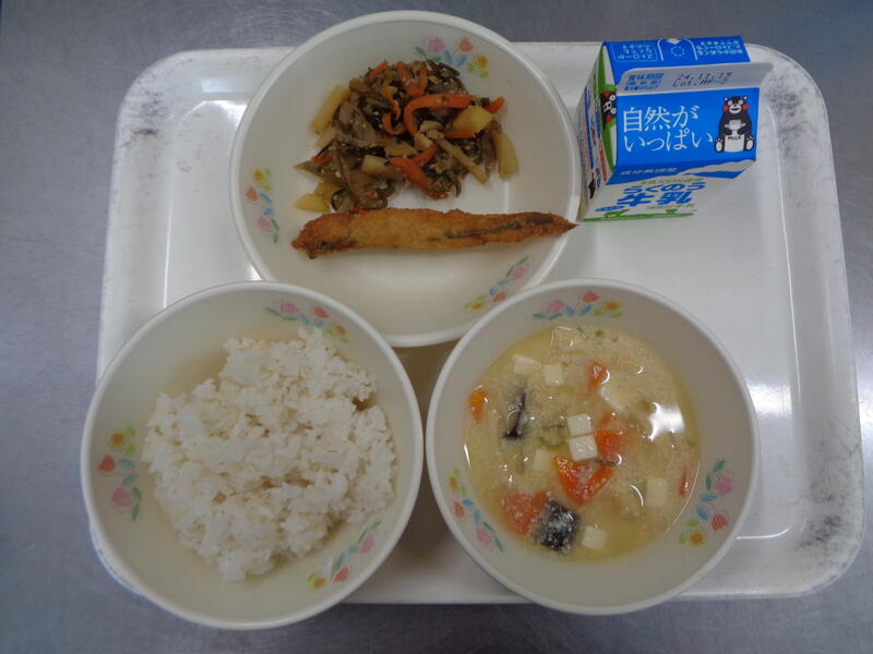 かみかみご飯 牛乳 じゃが芋のみそ汁 切干大根サラダ
