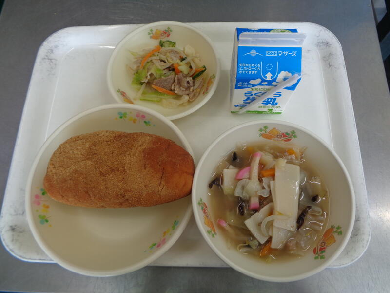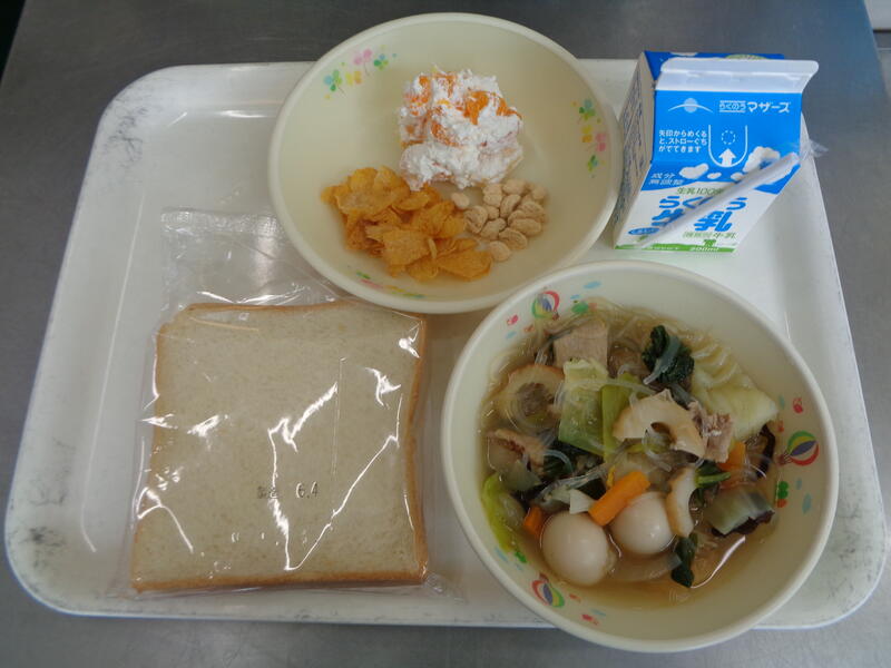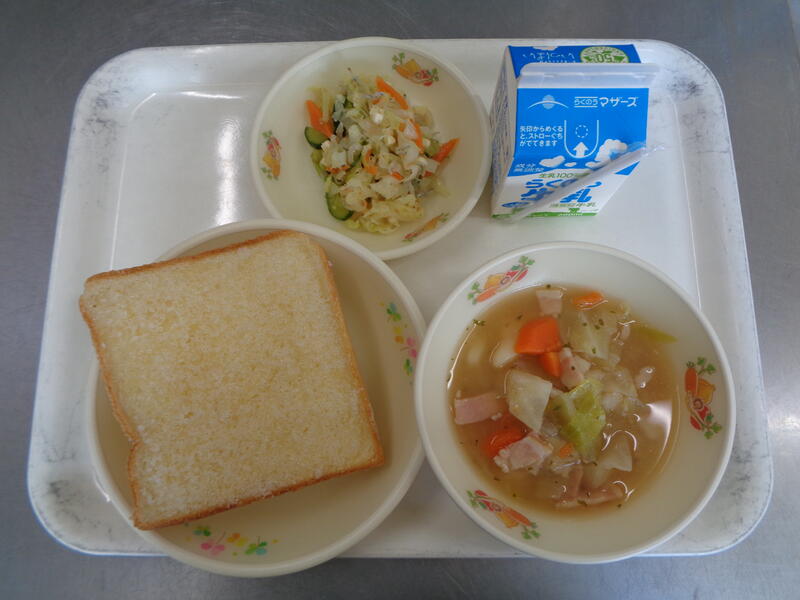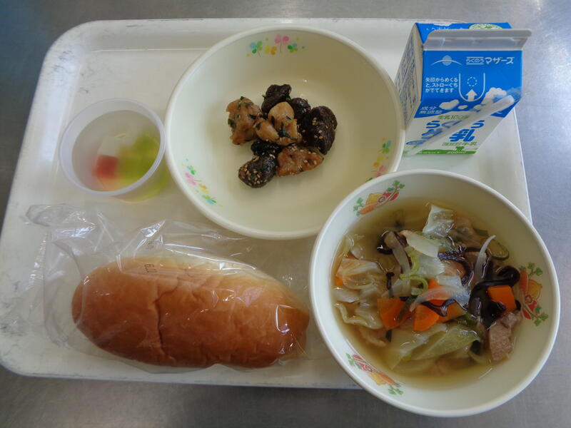 ミルクパン 牛乳 五目スープ 元気が出るレバー あじさいゼリー
