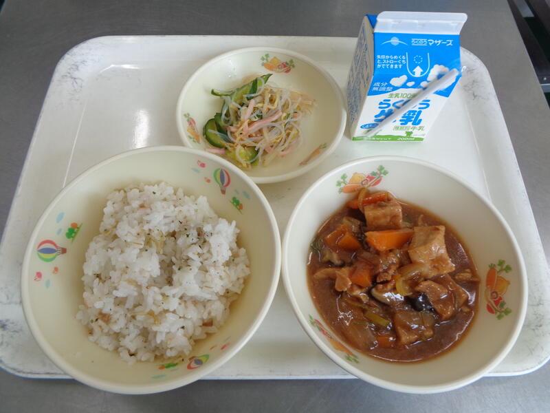 ハヤシライス 牛乳 海藻サラダ 晩柑ゼリー