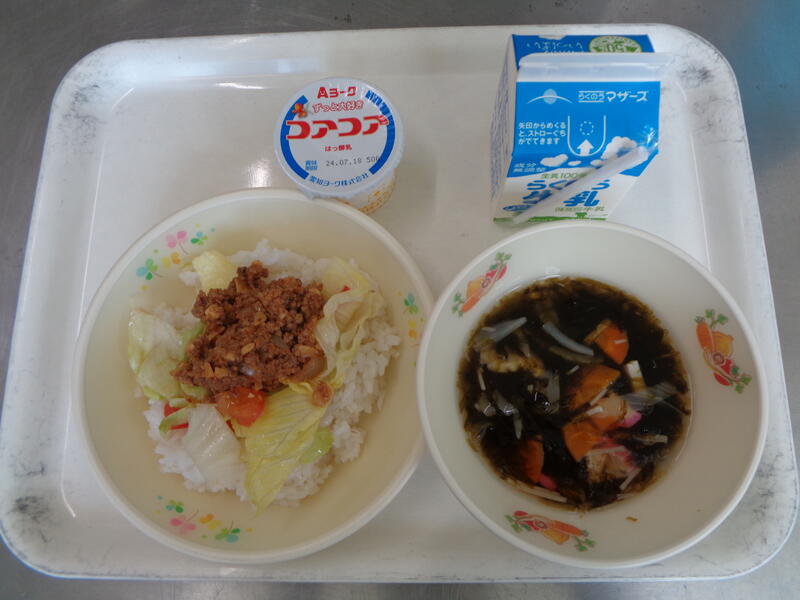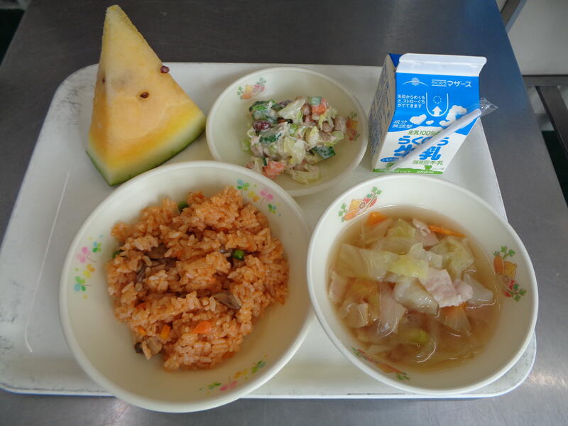 チキンライス 牛乳 野菜スープ ビーンズサラダ すいか