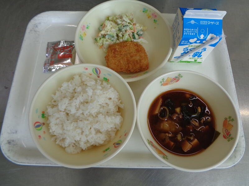 麦ご飯 牛乳 豆腐汁 きゃべつのメンチカツ 昆布とじゃが芋のきんぴら