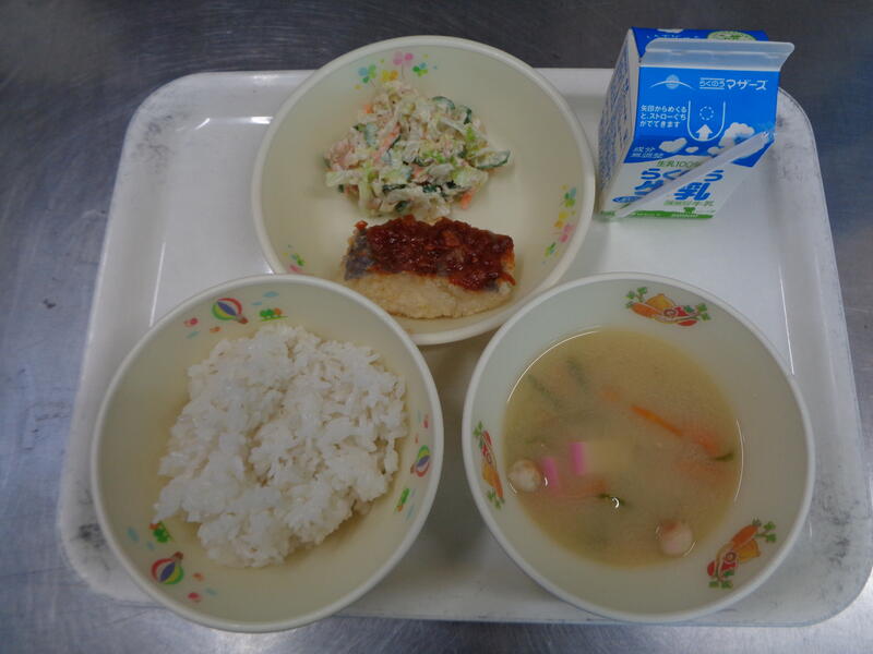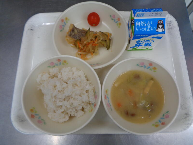 麦ご飯 牛乳 さつま汁 鯖のごま味噌煮 野菜の甘酢和え