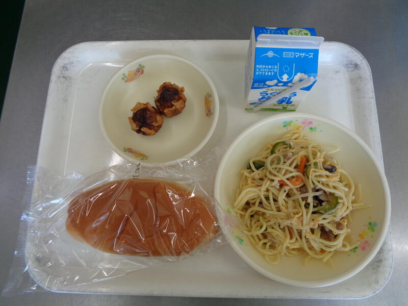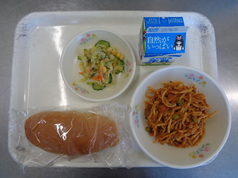 今日は読書月間第2弾の献立です。『スパゲッティがたべたいよう』角野栄子さんの絵本の中に登場するスパッゲッティを、絵本を読んで想像して作ってみました。図書の竹下先生からは、「給食の先生方とおばけのアッチが作った?お日様色のトマトソースにひき肉がたっぷり入ったミートスパゲッティです!」と紹介がありました。