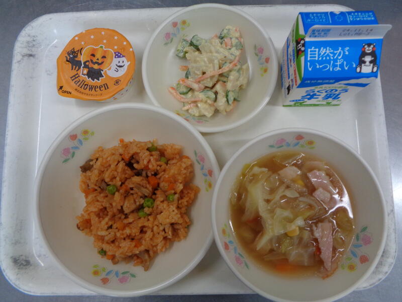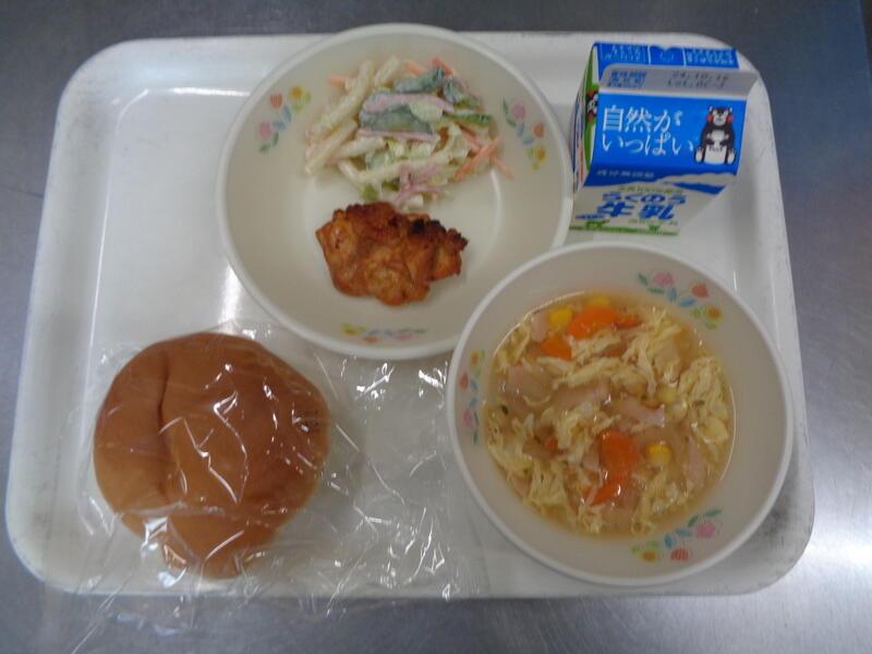チキンライス 牛乳 コーンスープ れんこんサラダ