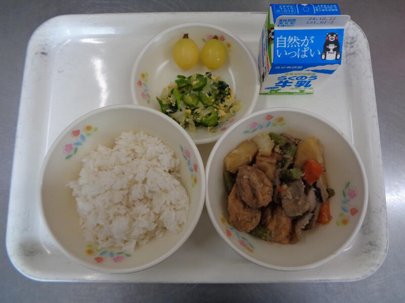 麦ご飯 牛乳 がんもと野菜のうま煮 山吹和え シャインマスカット