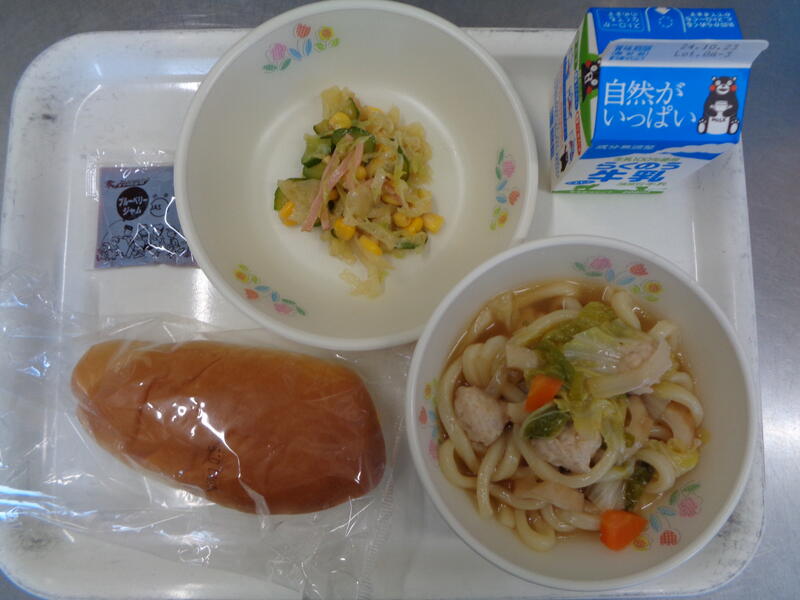 ミルクパン 牛乳 ちゃんこうどん コーンサラダ ブルーベリージャム