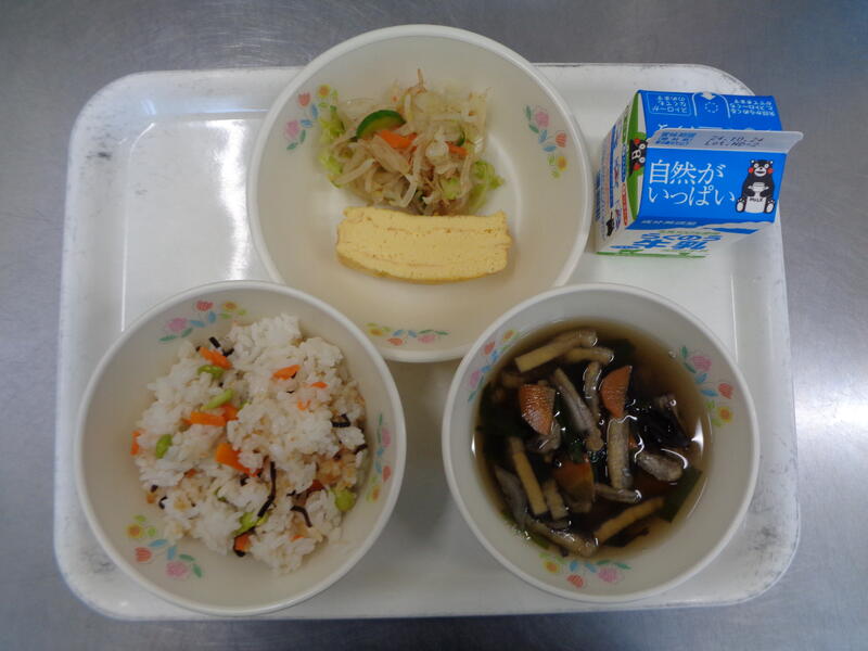 人参ごはん 牛乳 五目汁 卵焼き おかか和え
