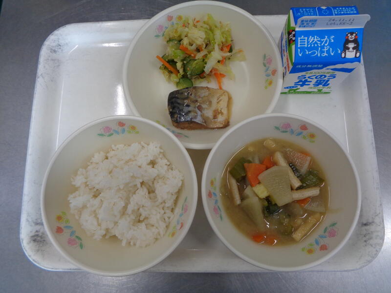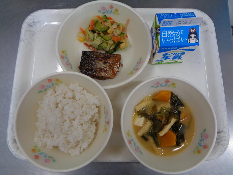 麦ご飯 牛乳 けんちん汁 鯖の塩焼き 豆腐サラダ