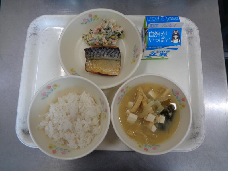 麦ご飯 牛乳 玉ねぎのみそ汁 鯖の塩焼き ひじきサラダ