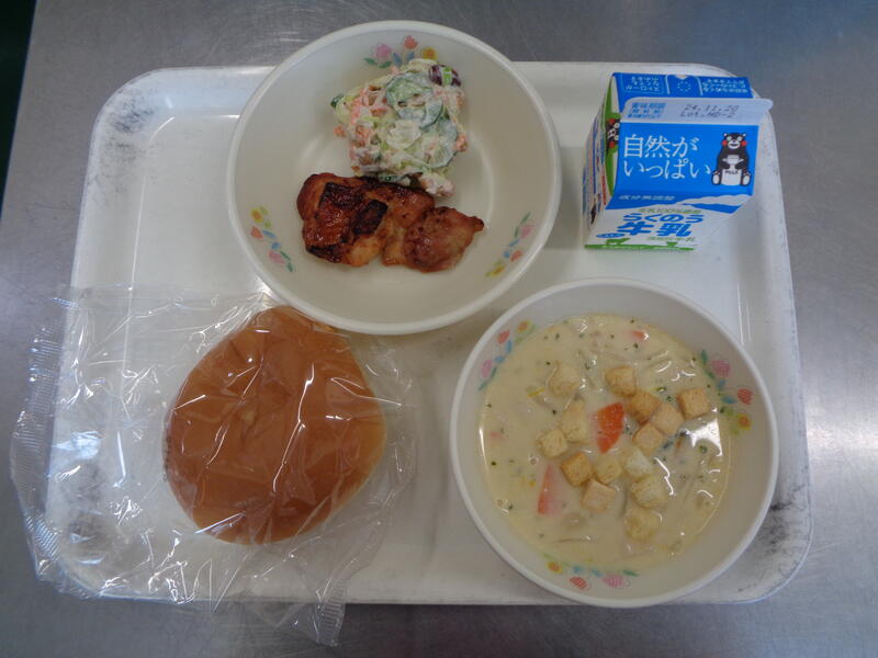 丸パン 牛乳 3びきのくまのかぼちゃスープ 照り焼きチキン ビーンズサラダ
