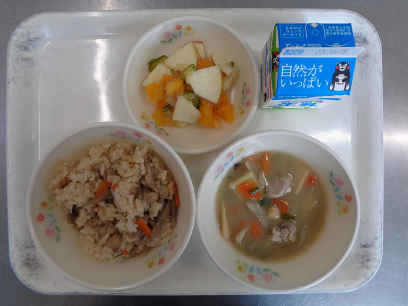 今月の「ふるさとくまさんデー」は「上益城地区」の献立です。山都町の清和地区には人形劇である清和文楽が残っています。この文楽を観るときに食べていた山菜を入れた炊き込みご飯が「文楽めし」です。