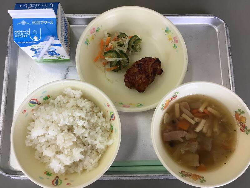 今日の肉団子スープの肉団子は手作りです。鶏ひき肉と卵、でんぷんを混ぜてスープの中に一つ一つちぎって作っています。色々な形があるかもしれません。みなさんのスープの中にはどんな形の団子が入っているでしょう。