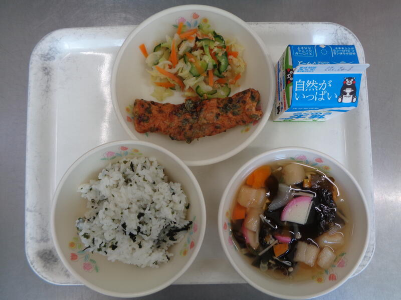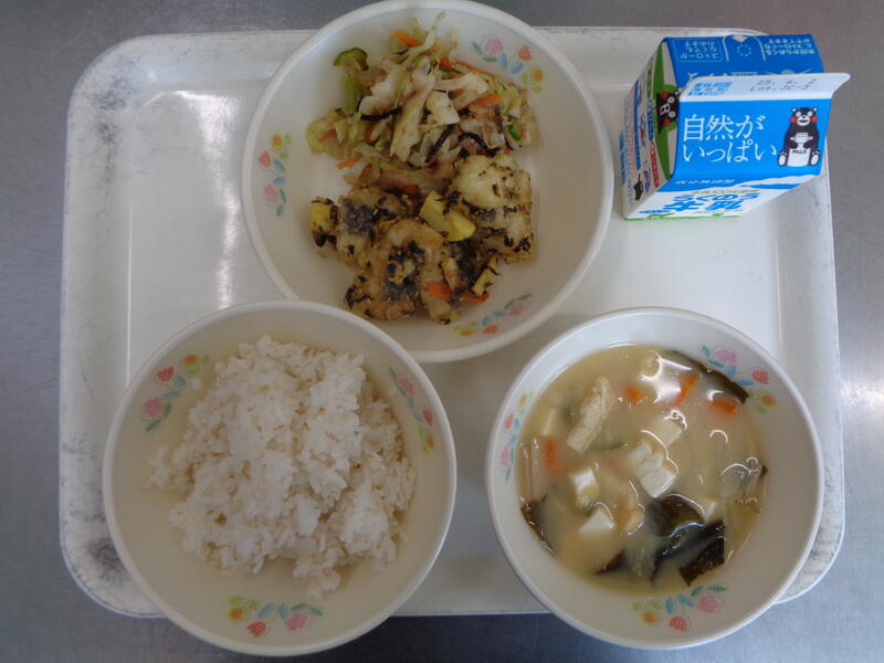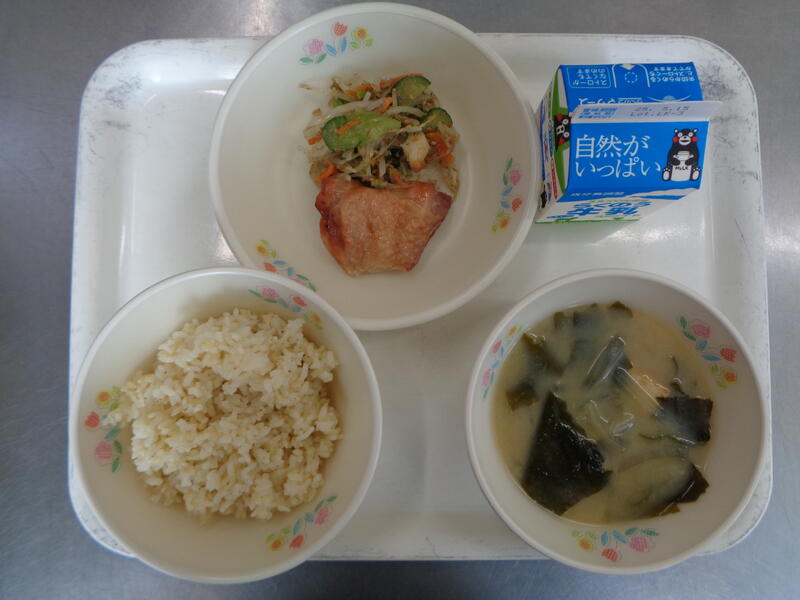 麦ご飯 牛乳 かきたま汁 鶏肉の梅風味焼き 昆布のさっぱり和え