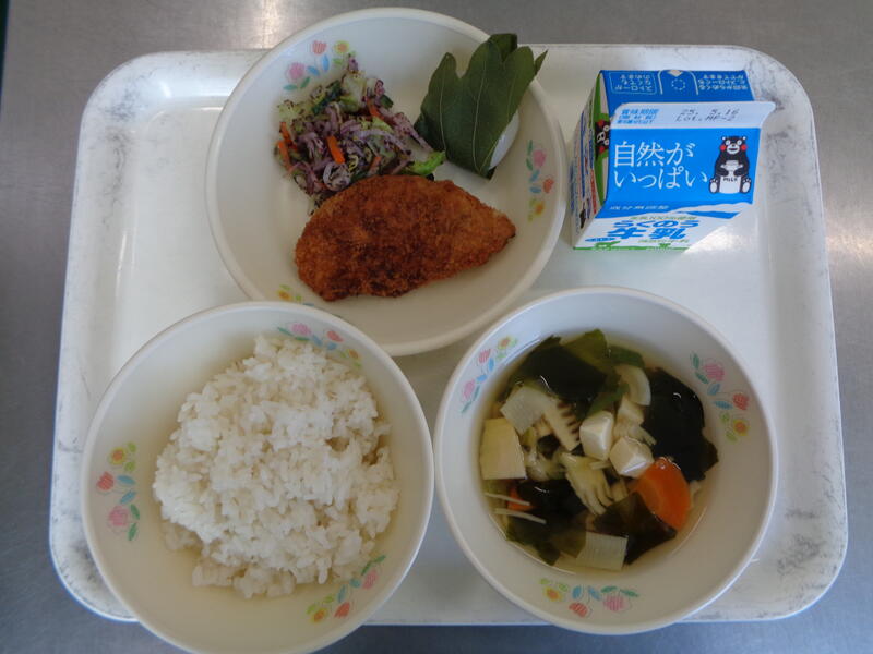 麦ご飯 牛乳 若竹汁 かつおフライ ゆかり和え 柏餅