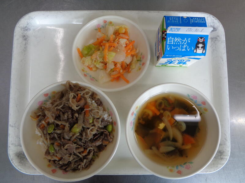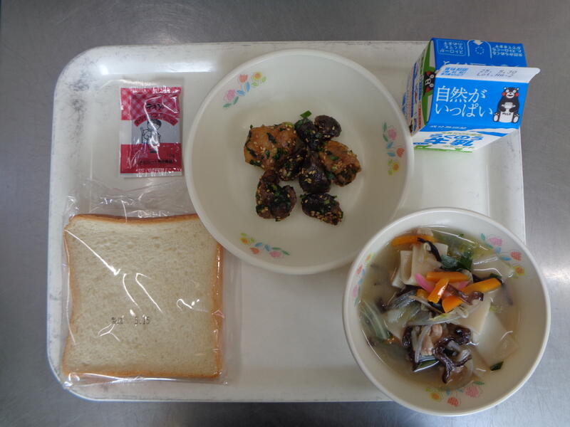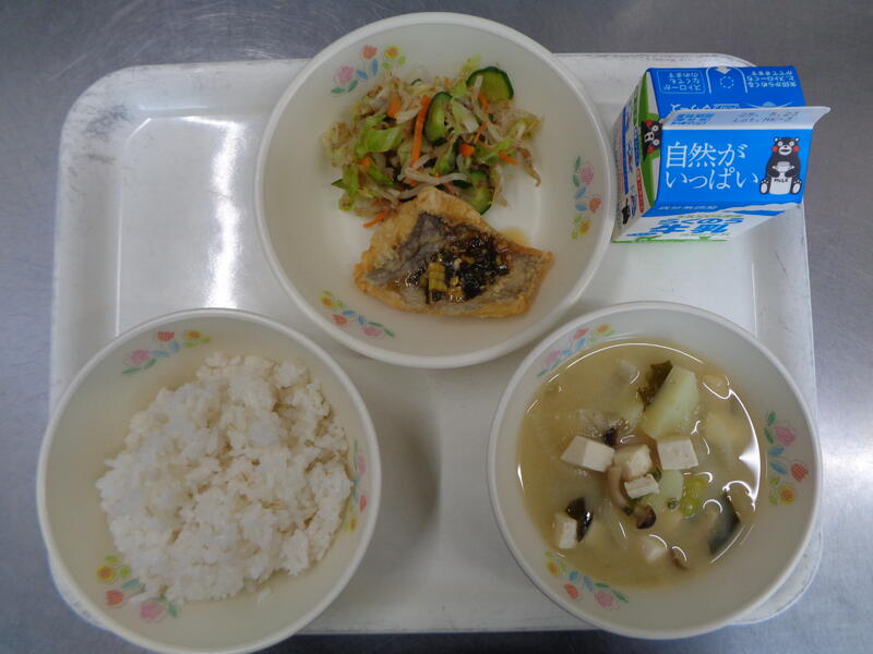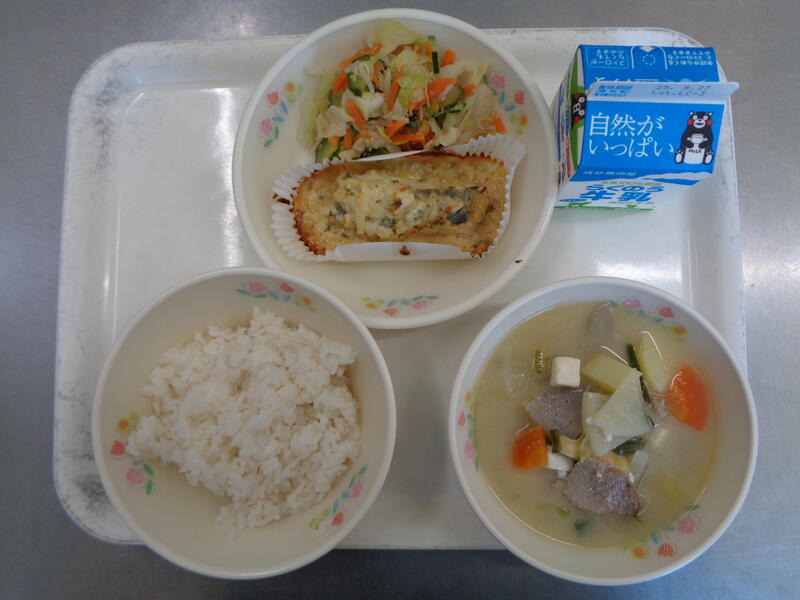 今月の「ふるさとくまさんデー」は「菊池の味」です。山鹿市の隣の菊池市はお米作りなどの農業が盛んに行われています。その中でも、水田ごぼうが有名です。水田ごぼうは、稲刈りが終わった田んぼにごぼうの種をまき、田植え前に収穫をしています。菊池渓谷の清らかな水をたくさん含んだ土で育っているので美味しいごぼうになります。