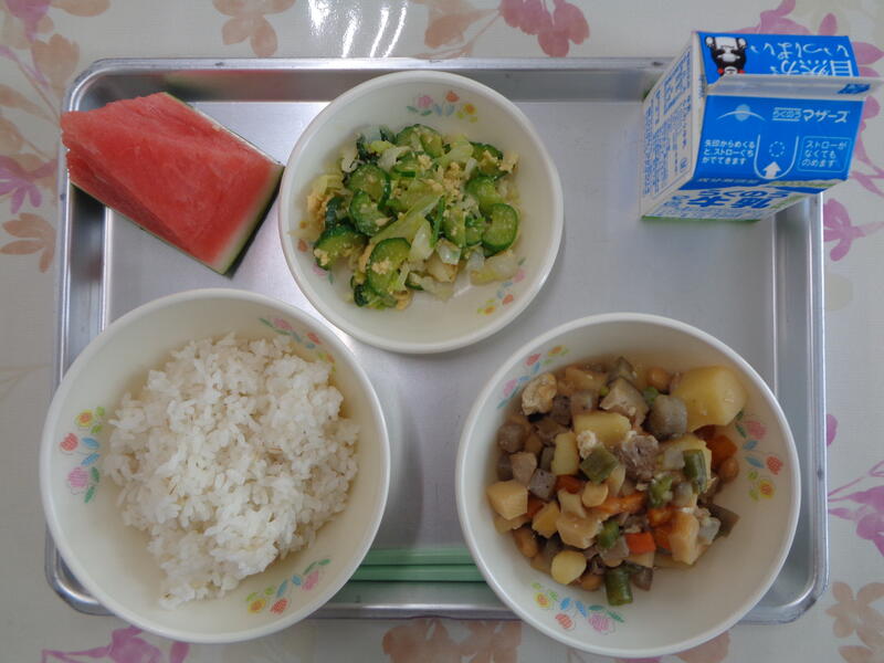 麦ご飯 牛乳 大豆の五目煮 山吹和え すいか
