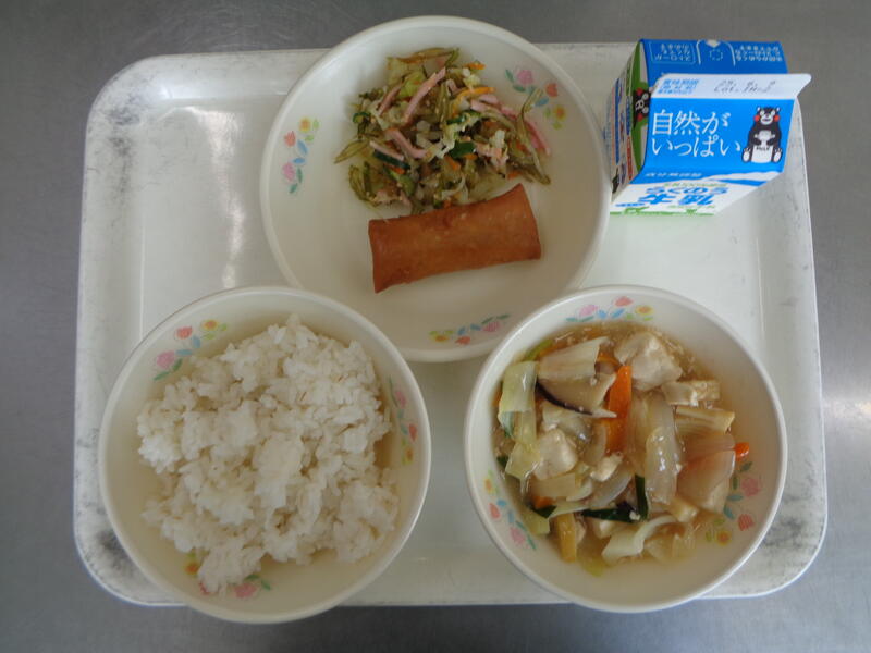 麦ご飯 牛乳 八宝豆腐 春巻き 茎わかめのサラダ