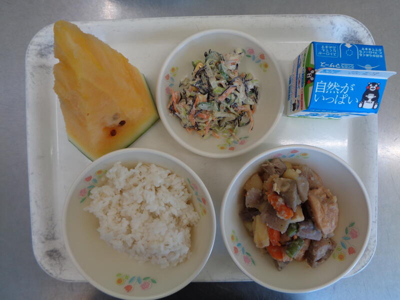麦ご飯 牛乳 がんもと野菜のうま煮 ひじきサラダ すいか