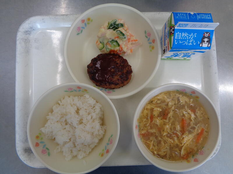 麦ごはん 牛乳 卵スープ ハンバーグ ポテトサラダ