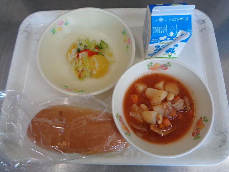 コッペパン 牛乳 トマトとレタスのスープ ポテトのカップ焼き