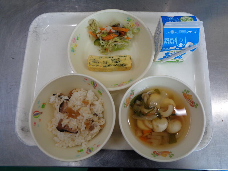 わかめご飯 牛乳 けんちん汁 厚焼き卵 おかか和え