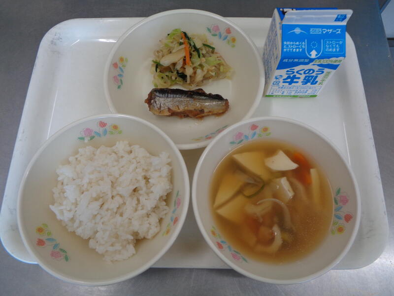 麦ご飯 牛乳 さんまのみぞれ煮 豆腐汁 アーモンド和え