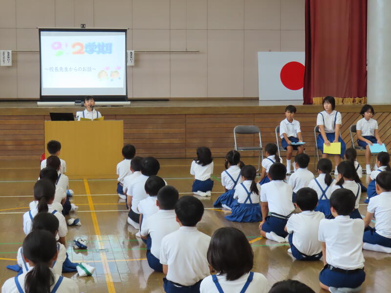8月27日(水)に2学期始業式がありました。最初に1・3・5・6年生の転入生紹介がありました。転入生を入れて三玉っ子155名でのスタートになりました。次に2・4・6年生の作文発表がありました。夏休みの思い出や2学期に頑張りたいことを堂々と話し、中には作文を見ずに発表する児童もいました。その後の校長先生の話では、「2学期も自分と同じように周りの人を大切にしましょう。」「気づき力、判断力、がむしゃら力の『3力(みりょく)』を頑張りましょう。」などの話がありました。また、生徒指導担当からの話では、身なりをきちんと整える重要性について再度確認がありました。