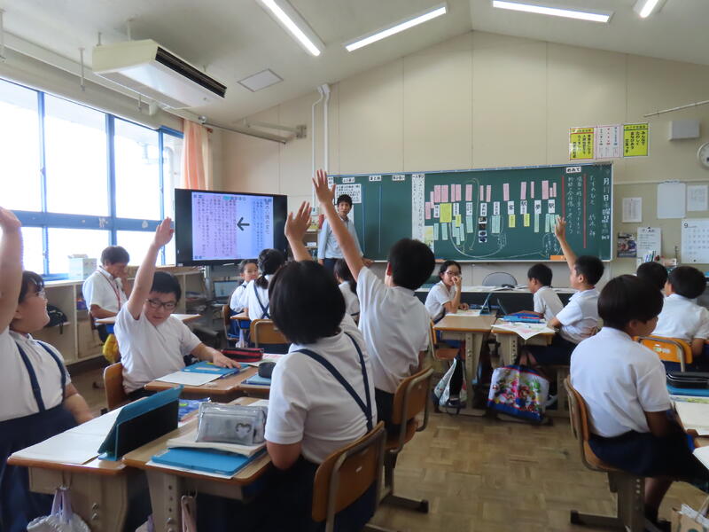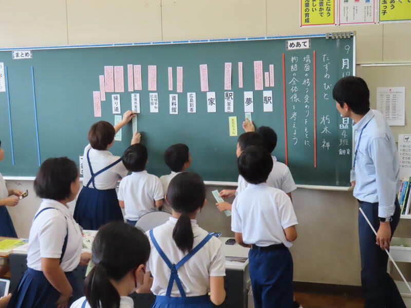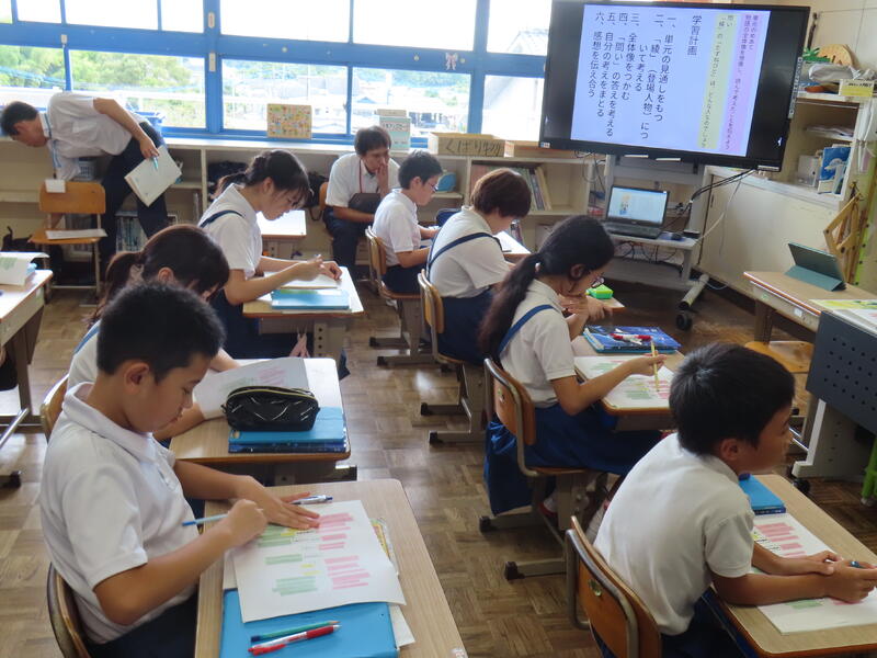 9月17日(水)に5年生の研究授業を行いました。今回の研究授業では、本校職員だけでなく、宇土市立網津小学校の下中教頭先生を講師としてお招きし、授業参観後の研究会ではご助言をいただきました。物語文の「たずねびと」の授業を行い、物語の全体像について対話を中心に深めることができました。「5年生が自分の意見をもって、活発に話し合っている姿が印象的だった。」「ペアやグループなど様々な形態で学習しており、目標達成に向けてみんなが頑張っていた。」など、たくさんのお褒めの言葉をいただきました。