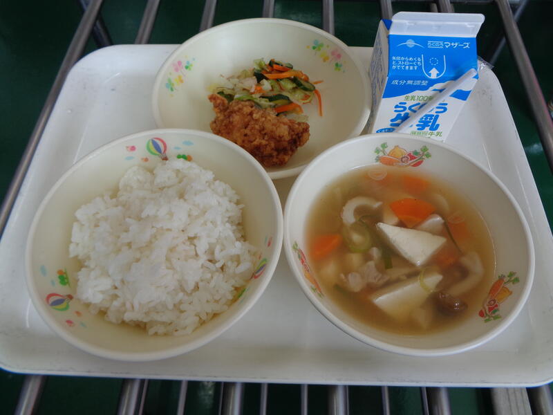 毎月19日は食育の日です。この日は「ふるさとくまさんデー」として給食では熊本県内の郷土料理や特産品、食材を使った献立を紹介していきます。献立の都合上入れ替わることもあります。4月は私たちが住む山鹿のたけのこを使って、「たけのこご飯」を作りました。