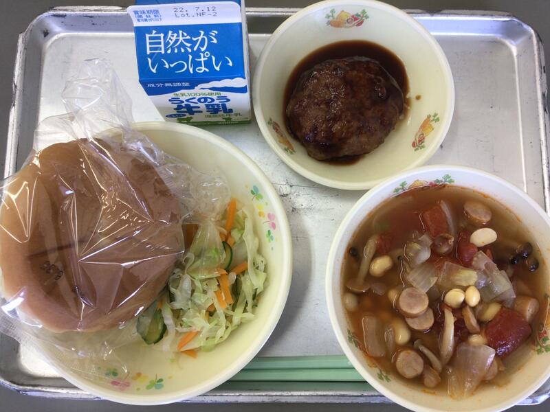 ハンバーグは どうしてハンバーグっていうの?答えは、ドイツのハンブルクという町で人気になった料理なので、ハンブルク・ステーキといわれていました。それがアメリカに伝わって、ハンバーグ・ステーキになりました。もともとは、中央アジアに住んでいる、タタール人の食べていた タルタル・ステーキがはじまりです。給食室では、200個のハンバーグを 手作りしてみました。