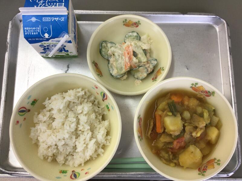 今日は七夕です。織姫と彦星が一年に一度だけ会える日です。その思いを込めておくら ナタデココ コロッケをお星さまの形に天の川をそうめんで 表してみました。夜晴れてたくさんの星が見えるといいですね。