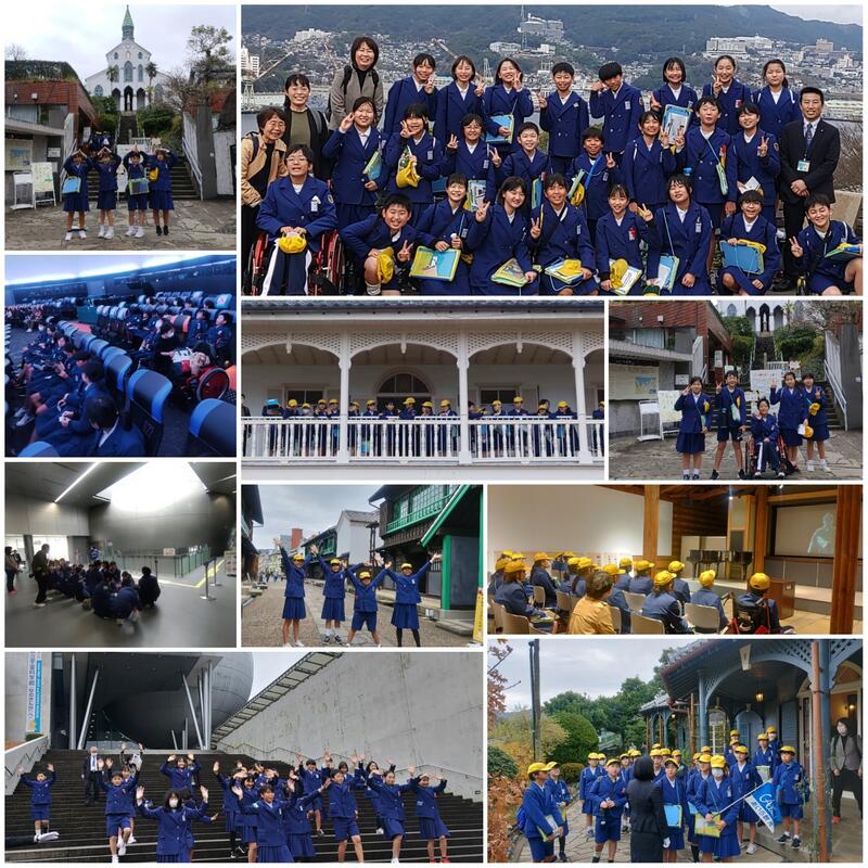 1日目は有明フェリーで島原半島へ渡り、諫早を経由して長崎市内に入りました。城山小学校、平和公園、如己堂、浦上天主堂、原爆落下中心地、原爆資料館を見学し、平和について深く学んだ子どもたちでした。夜はホテルの屋上から、長崎の夜景を楽しみました。