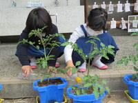2年生は、ミニトマトの苗を植えました。毎日、朝から水かけを頑張っています。もう、既にお花がつき始めた人もいます。「かわいい花だなぁ。」「早く実がなるといいなぁ。」等と話ながらお世話にしていました。