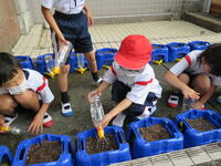 生活科の学習で、1年生は朝顔の種をまきました。最初に先生から朝顔の種のまき方についてタブレットを使って説明がありました。そして、実際に中庭で、小さな穴に、小さな朝顔の種を一粒ずつ一粒入れて、優しく土をかぶせました。「早く芽が出るといいなぁ。」「しっかりお世話するよ。」等とやる気満々でした。