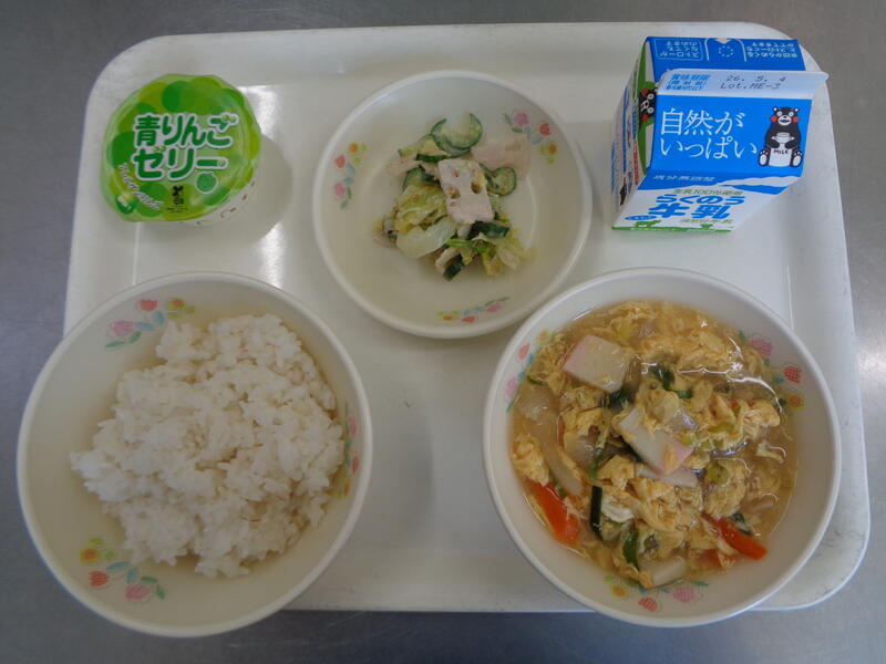 親子丼 牛乳 野菜のごまだれ 青リンゴゼリー