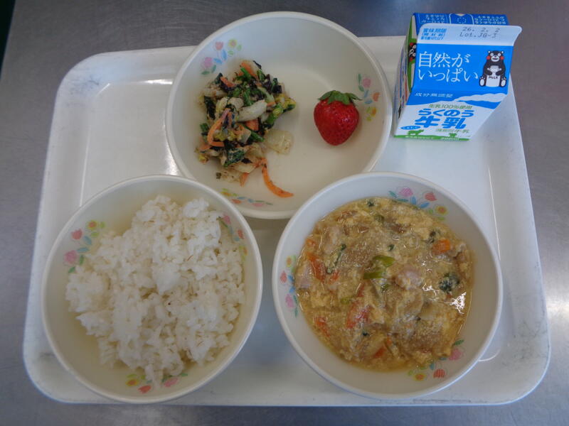 麦ご飯 牛乳 南関揚げ丼 磯和え いちご