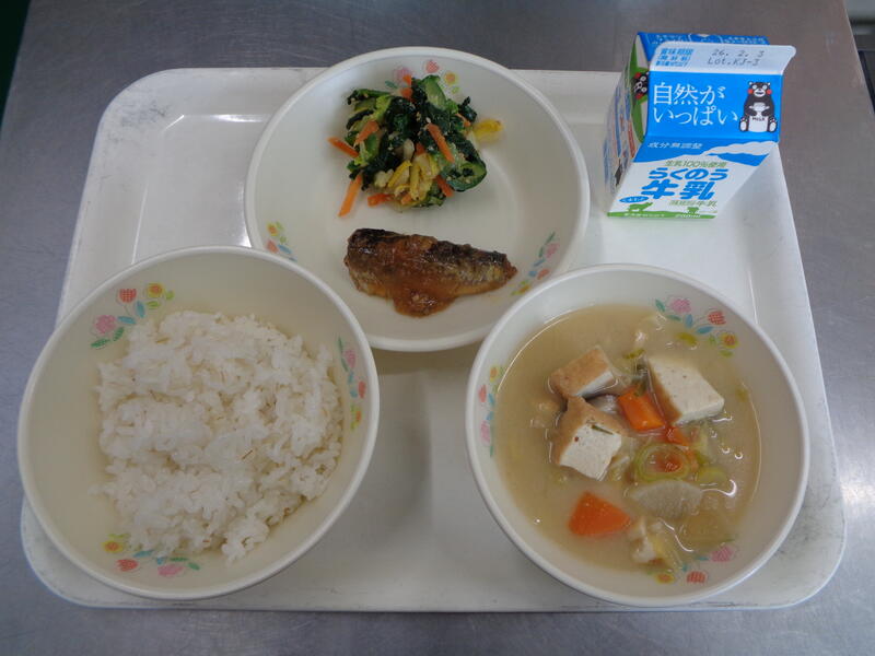 麦ご飯 牛乳 厚揚げのみそ汁 いわしのみぞれ煮 ほうれん草のごま和え