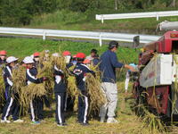 JA青年部の皆様のご指導のもと、手鎌での刈り取り、稲運び、コンバインでの脱穀を体験できました。