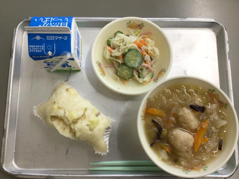 今日の蒸しパンは、甘酒・さつまいも・ホットケーキミックス・薄力粉・ベーキングパウダー・水を大きなたらいに入れて混ぜ合わせ、1つ1つカップに入れて蒸し器で蒸します。三玉小学校で蒸してあるので、できたての蒸しパンです。