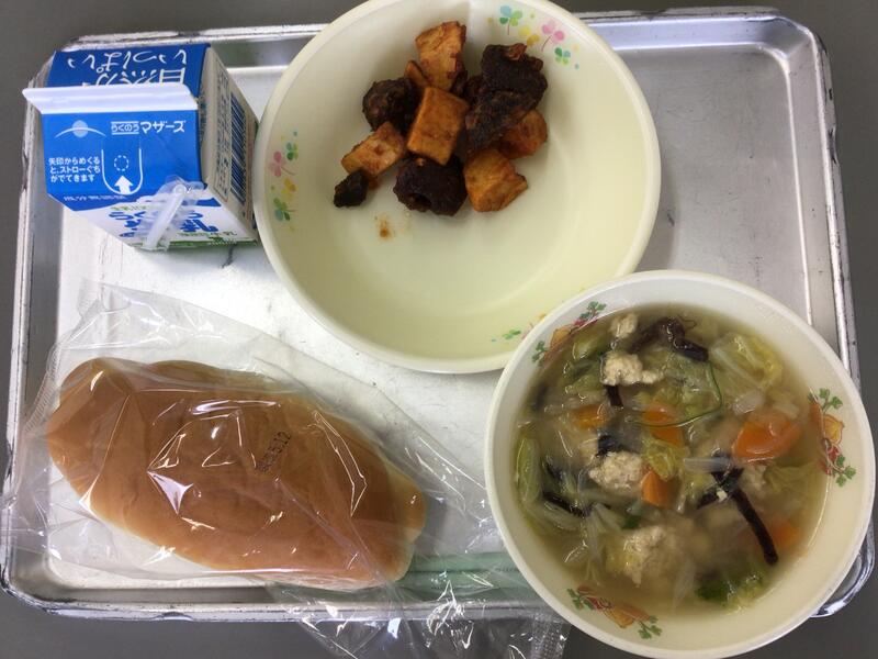 今日の肉団子スープの肉団子は手作りです。鶏ひき肉と卵、でんぷんを混ぜてスープの中に一つ一つちぎって作っています。色々な形があるかもしれません。みなさんのスープの中にはどんな形の団子が入っているでしょう。