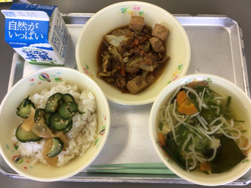 給食で食べているご飯には、麦が入っています。この麦は熊本県内で採れた大麦です。大麦は食物繊維がたくさん含まれていて、腸の働きを良くしてくれます。また、白ご飯だけよりも、カロリーが低くなり、満腹感も持続するので食べすぎを防ぐことが出来ます。