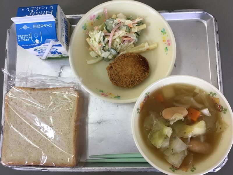 えだまめととうふのミンチカツ マカロニサラダ やさいのスープに