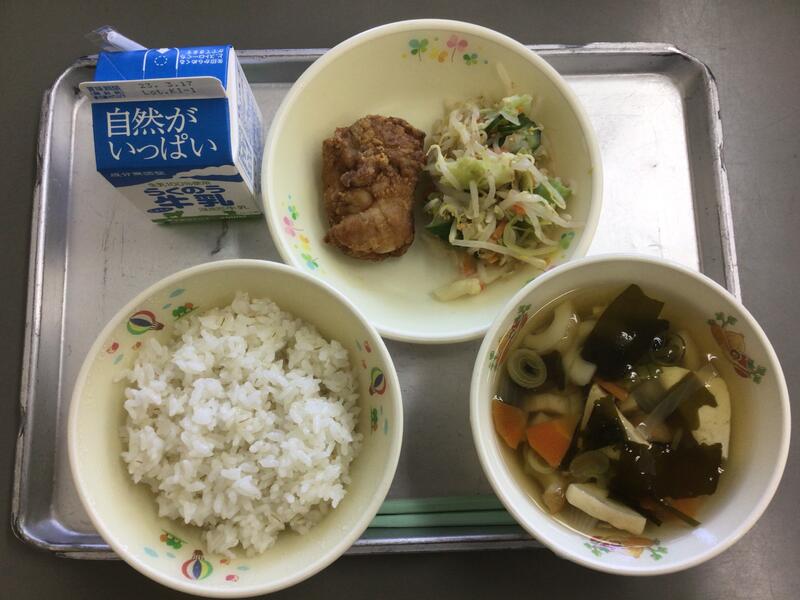 とりのからあげ ごまだれサラダ とうふじる