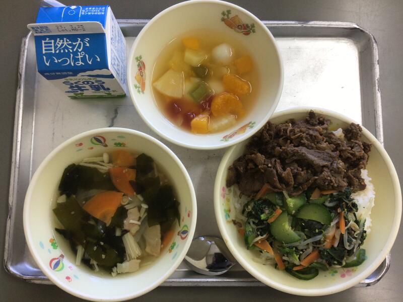 今日は6年生リクエスト第3位のフルーツポンチと第4位のビビンバです。今年度は西瓜をたくさん頂いた時にフルーツポンチを食べましたね!今年度は給食でなかなか果物を献立に入れることができませんでしたが、三玉小学校校区では、スイカ・みかん・いちご・梨・ぶどうなどたくさんの果物が作られています。お家では、給食でとれていない果物やその他の食べ物を食べるように心がけましょう!