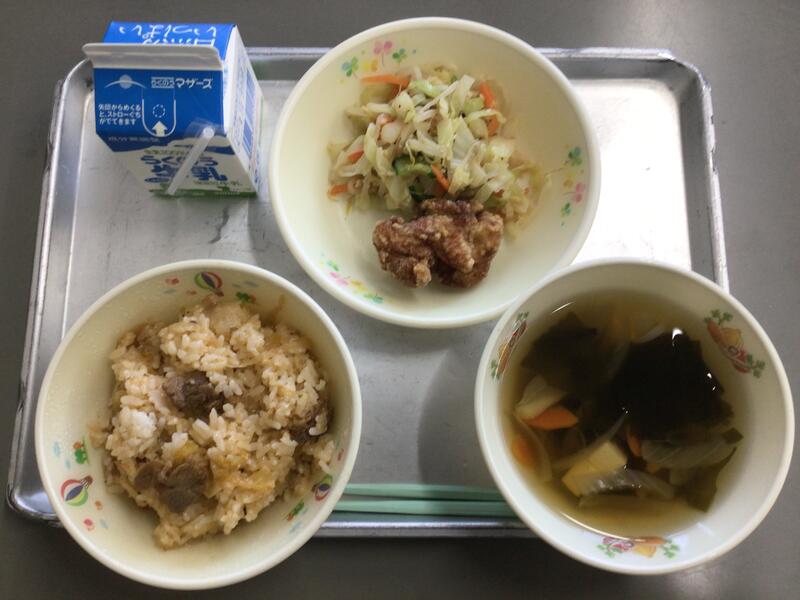 九州地方では鶏肉のことを「かしわ」と呼びます。鶏肉や具材を煮詰めて炊いたご飯に混ぜたご飯を「かしわ飯」と言います。給食では、具材を煮詰めてご飯と一緒に炊き込んでいます。祭りや行事のときに作る郷土料理です。