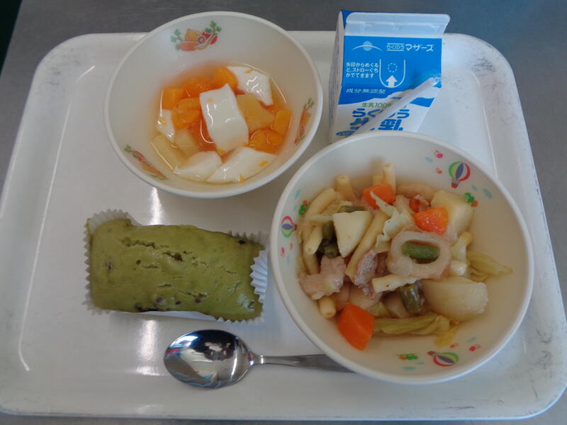 抹茶蒸しパン 牛乳 豚肉と野菜の煮込み フルーツ杏仁