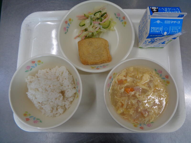 麦ご飯 牛乳 根菜入り肉信田 コーンと卵のスープ グリーンサラダ